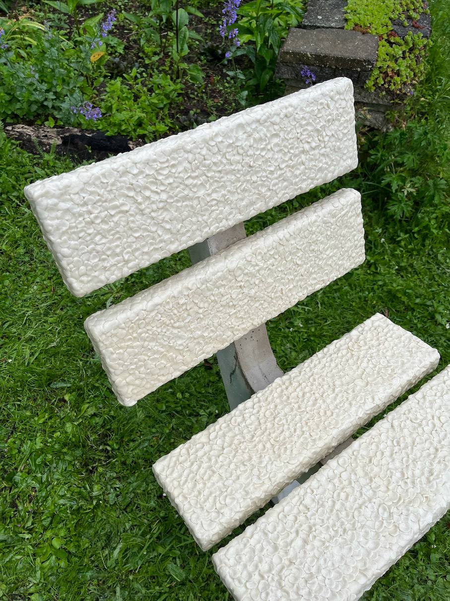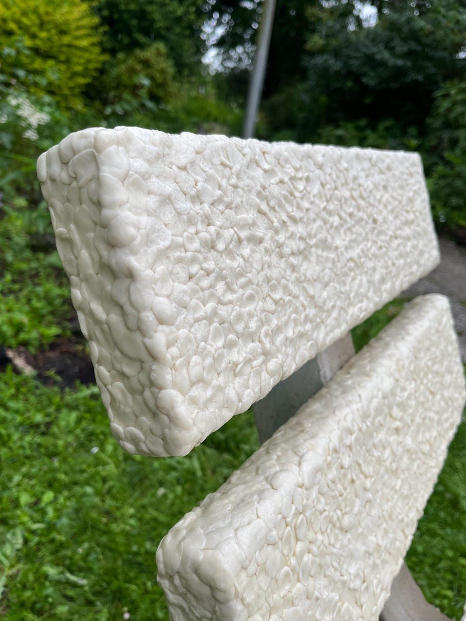 Chewing gum is everywhere - on the sidewalk, under tables, and now, on this chair. This unique creation, inspired by the park bench, takes us on a journey of fascination and disgust.